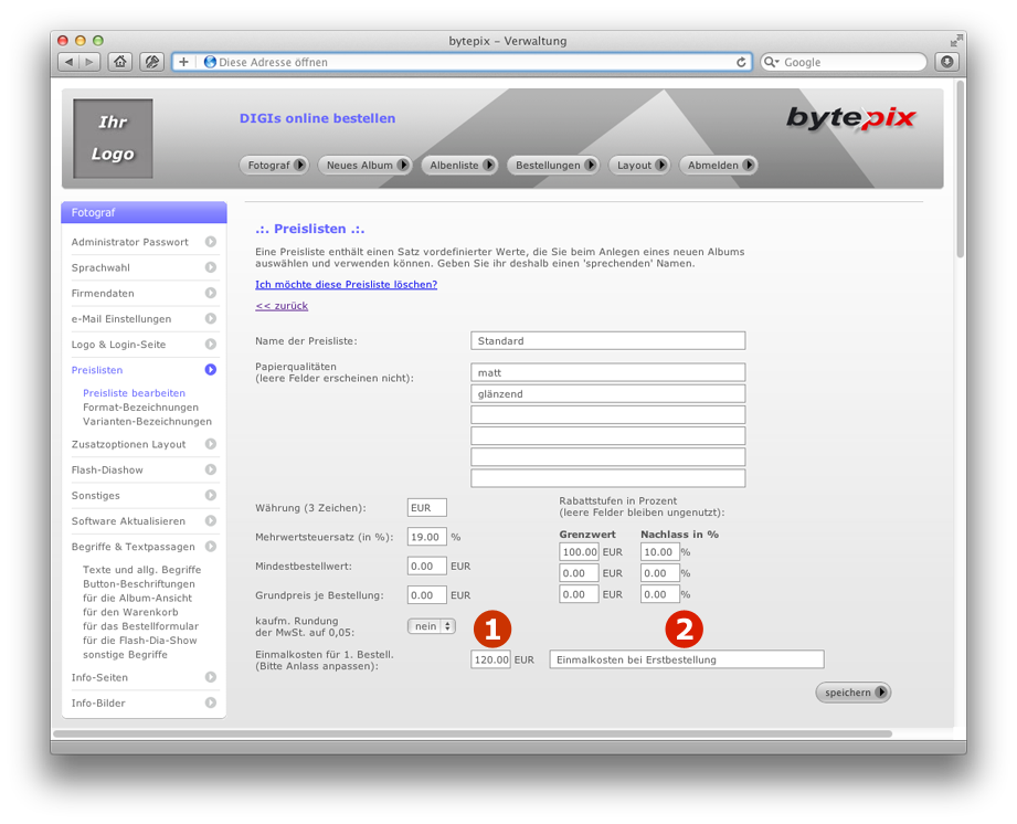 Sie finden die beiden Felder "Einmalkosten für 1. Bestellung" sowohl in den Preislisten als auch unter "Formate & Preise" beim jeweiligen Album. Die Felder sind Bestandteil der Preislisten, um die Erstellung von neuen Alben zu vereinfachen, sozusagen als Vorlage. Lassen Sie den Wert auf € 0,00, wenn Sie jeweils individuell entscheiden möchten, ob diese Zusatzkosten in einem Album zur Anwendung kommen sollen.